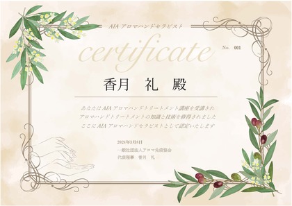 認定試験に合格されると、アロマ免疫協会認定の「アロマハンドセラピスト」の